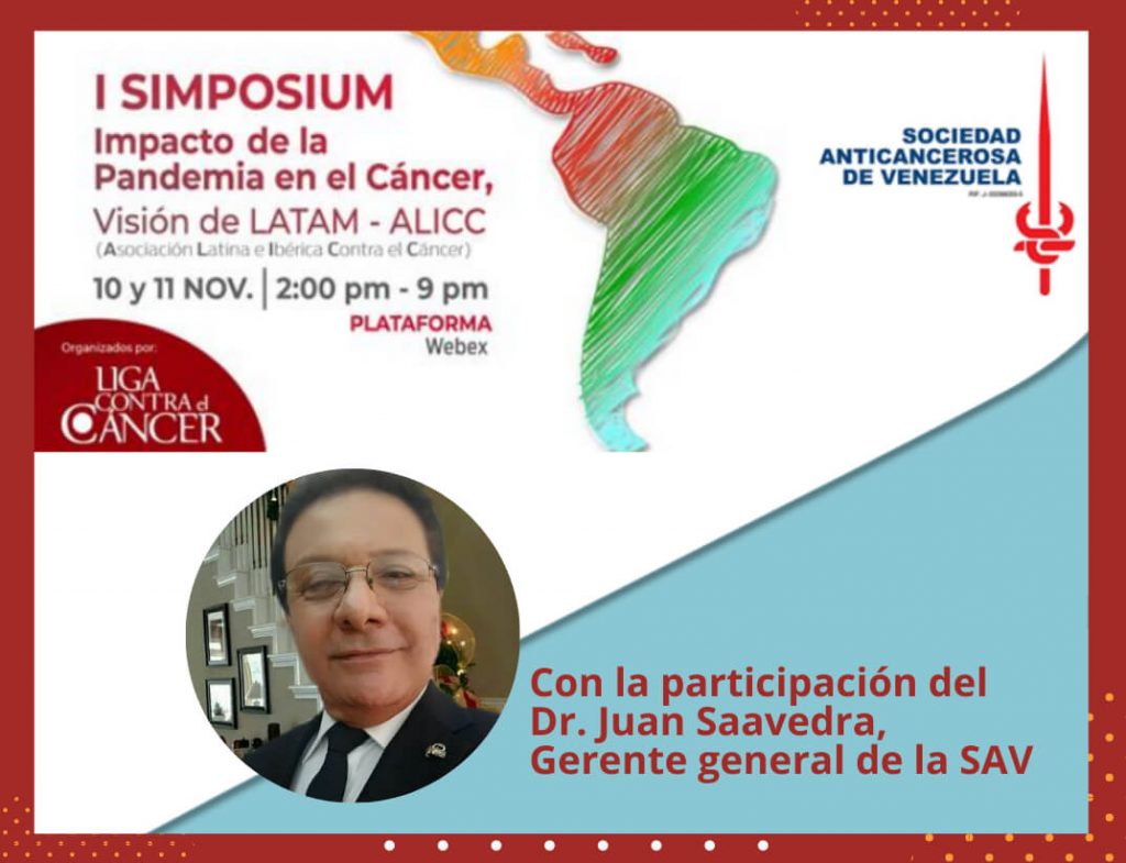 Con la intervención de nuestro gerente general, Dr. Juan Saavedra, la Sociedad Anticancerosa de Venezuela estuvo presente en el I Simposium Impacto de la Pandemia en el Cáncer, un evento virtual de la Asociación Latina e Ibérica Contra el Cáncer (ALICC) bajo la organización de la Liga Contra el Cáncer de Colombia.