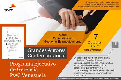 La octava presentación del “Programa Ejecutivo de Gerencia PwC Venezuela – Grandes Autores Contemporáneos” se llevará a cabo el próximo jueves 07 de octubre 2021 a las 3:00pm y tratará sobre “Gestionar Estratégicamente, claves para tomar decisiones en la era de la incertidumbre” de la mano de su autor, el especialista en gestión y análisis estratégicos, Xavier Gimbert. Los animamos a participar en esta interesante conferencia a través de la plataforma WEBEX, registrándose en el siguiente enlace: https://bit.ly/3uAZ1tQ.